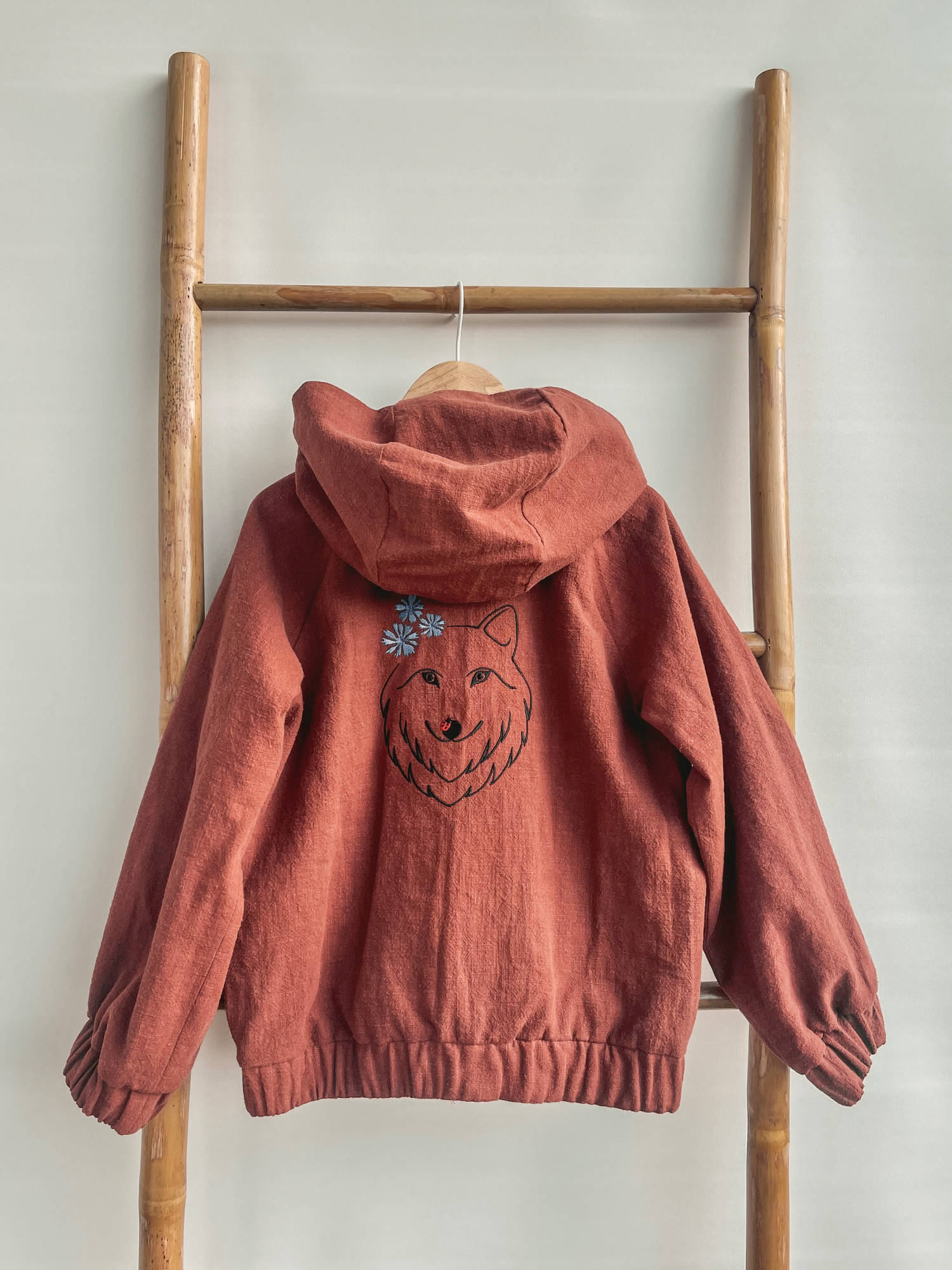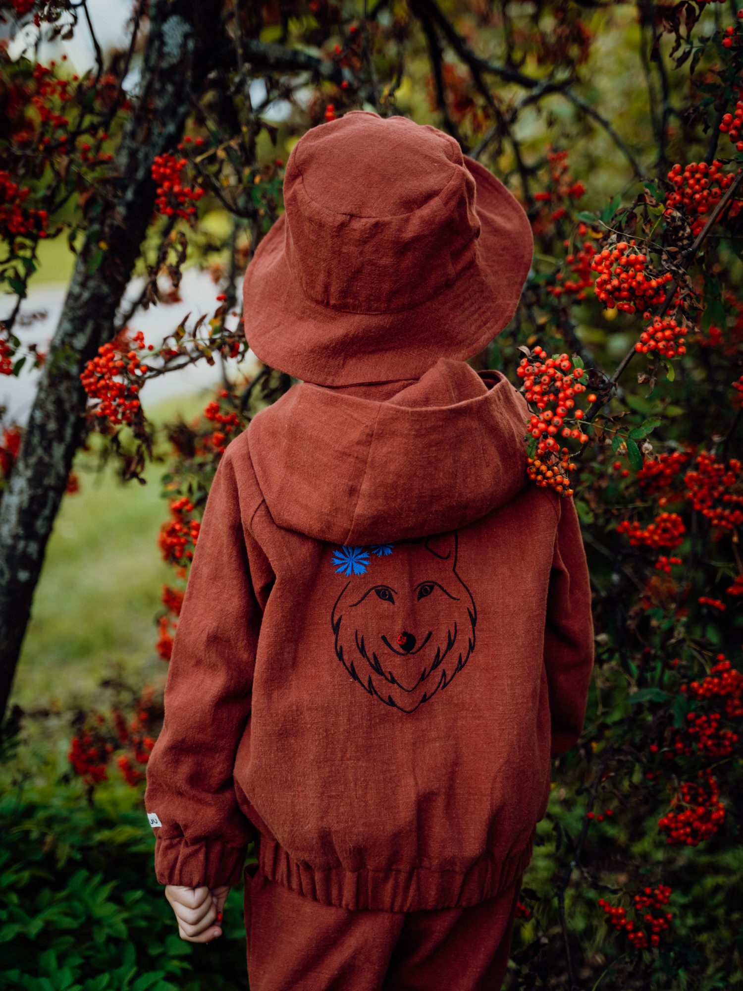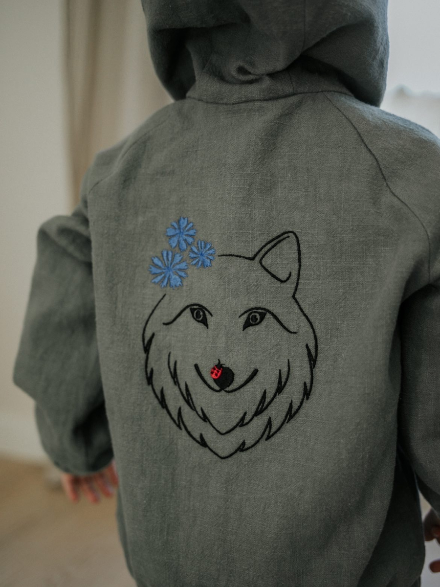 Unisex bomberjakk on hingavast linasest materjalist, mis on pehme ning on mõeldud aastaringseks kasutamiseks – soojemal ajal välisjakina, jahedamal ajal sisejakina. Seljaosa kaunistab hundi tikand, mis muudab kandmise lapsele mängulisemaks. Ees olevad trendikad trukid teevad bomberi kasutuse lihtsaks. Bomberil on ilutaskud. Bomberjakk on valmistatud keskkonna sõbralikust kangast, mis ei kortsu.