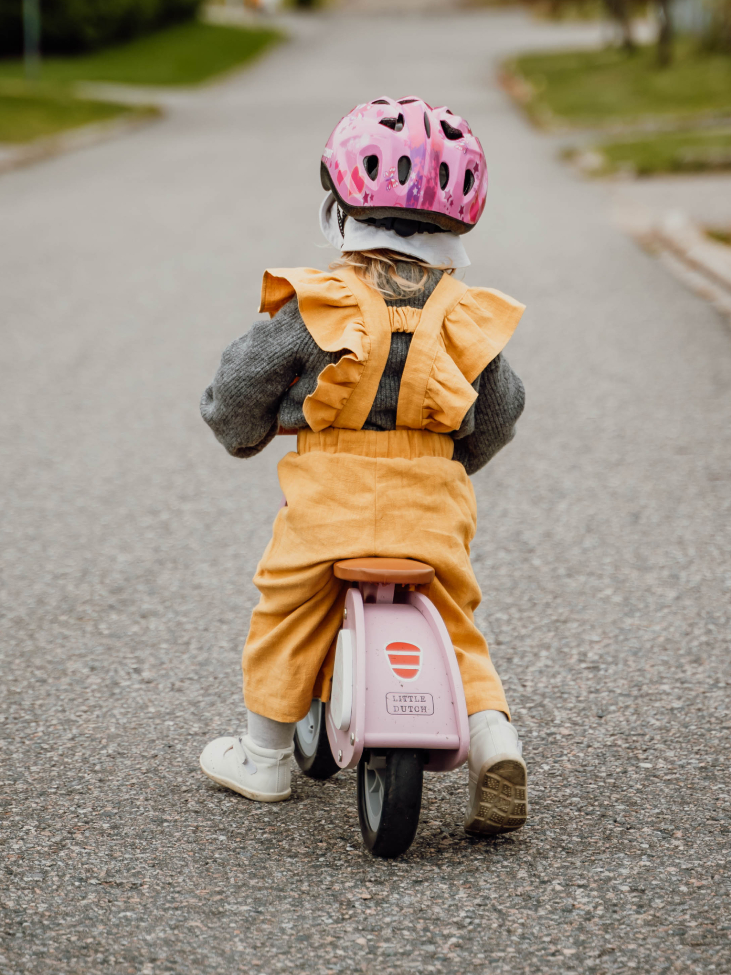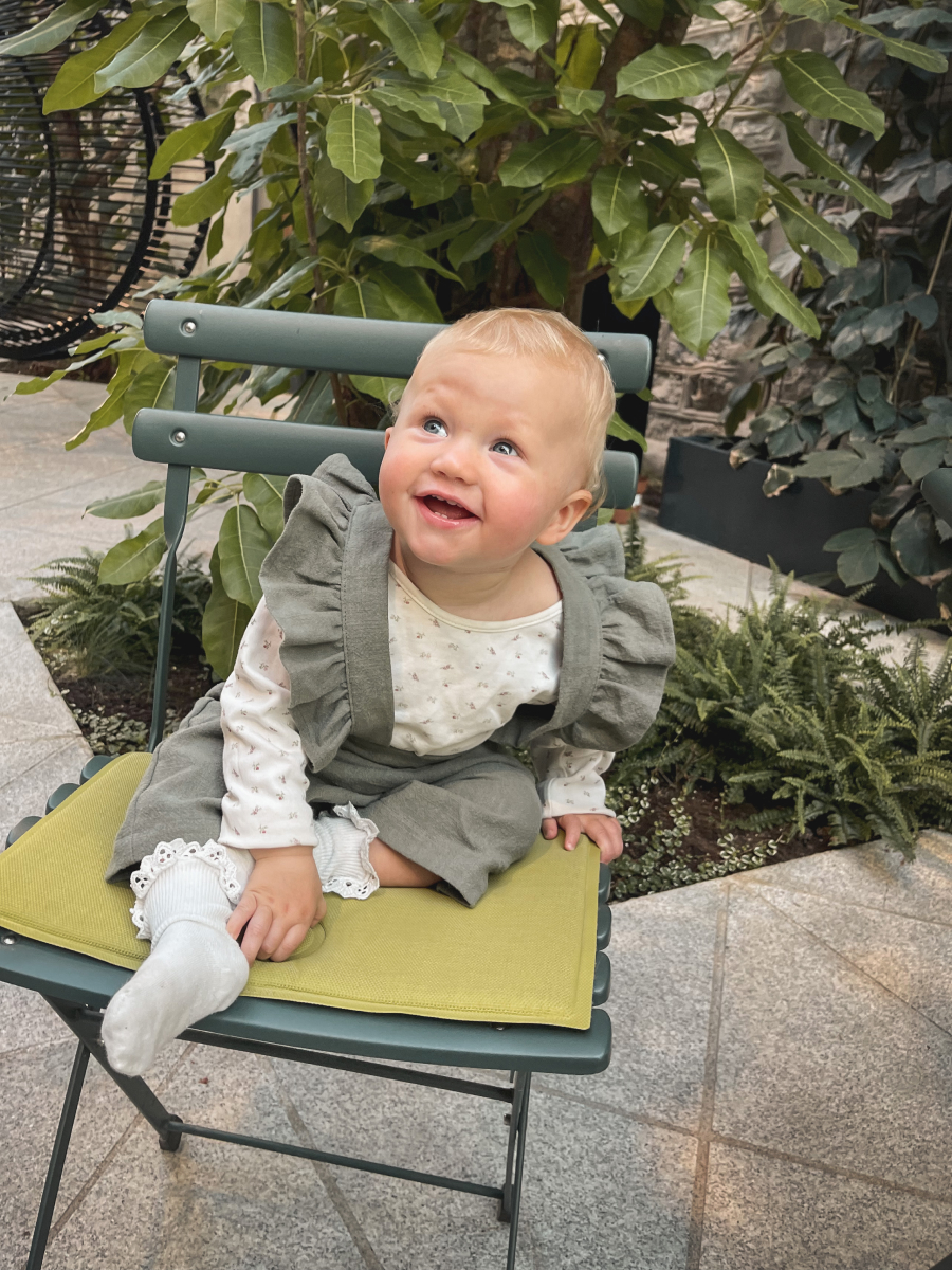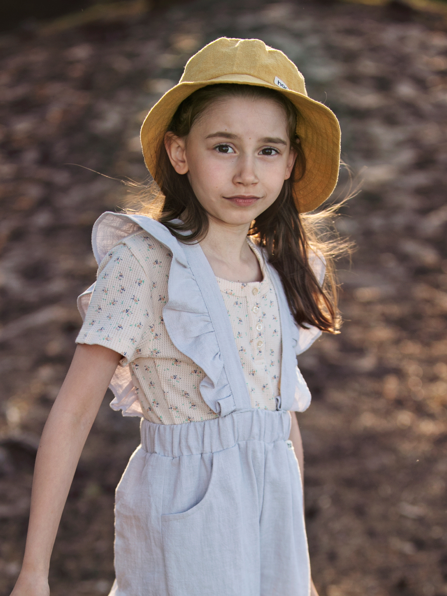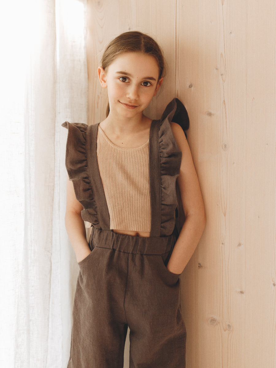 Tüdrukutele mõeldud traksipüksid on stiilse väljanägemisega, seejuures mugavad, kuna on hingavast linasest materjalist. Traksid on reguleeritavad ja selja peal olev väike kinniti hoiab trakse koos, et need alla ei vajuks. Reguleerimiseks on kasutatud looduslikke kookosnööpe. Traksipüksid on valmistatud keskkonna sõbralikust kangast, mis ei kortsu. 62/68 suurusel ei ole küljetaskuid.
