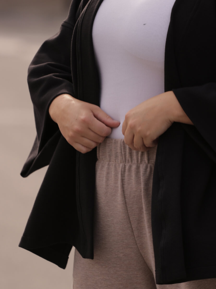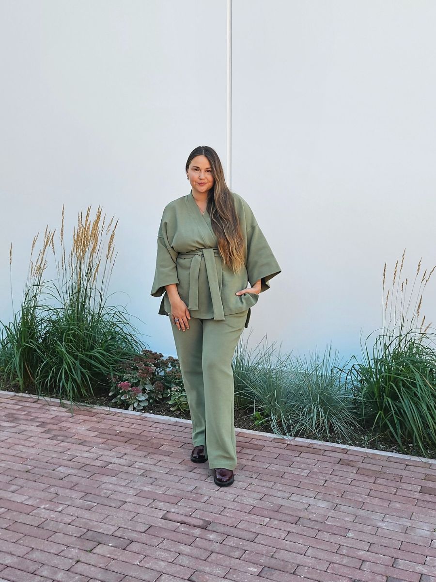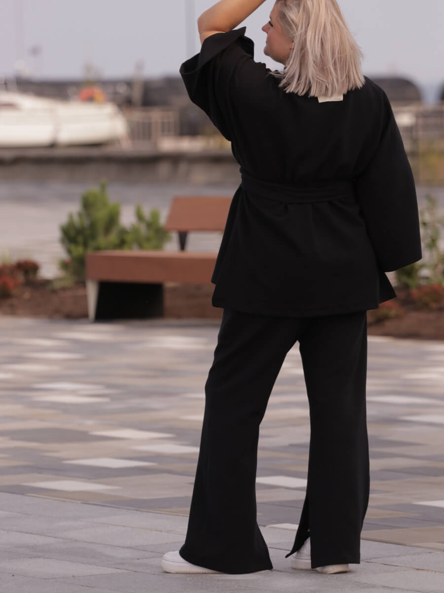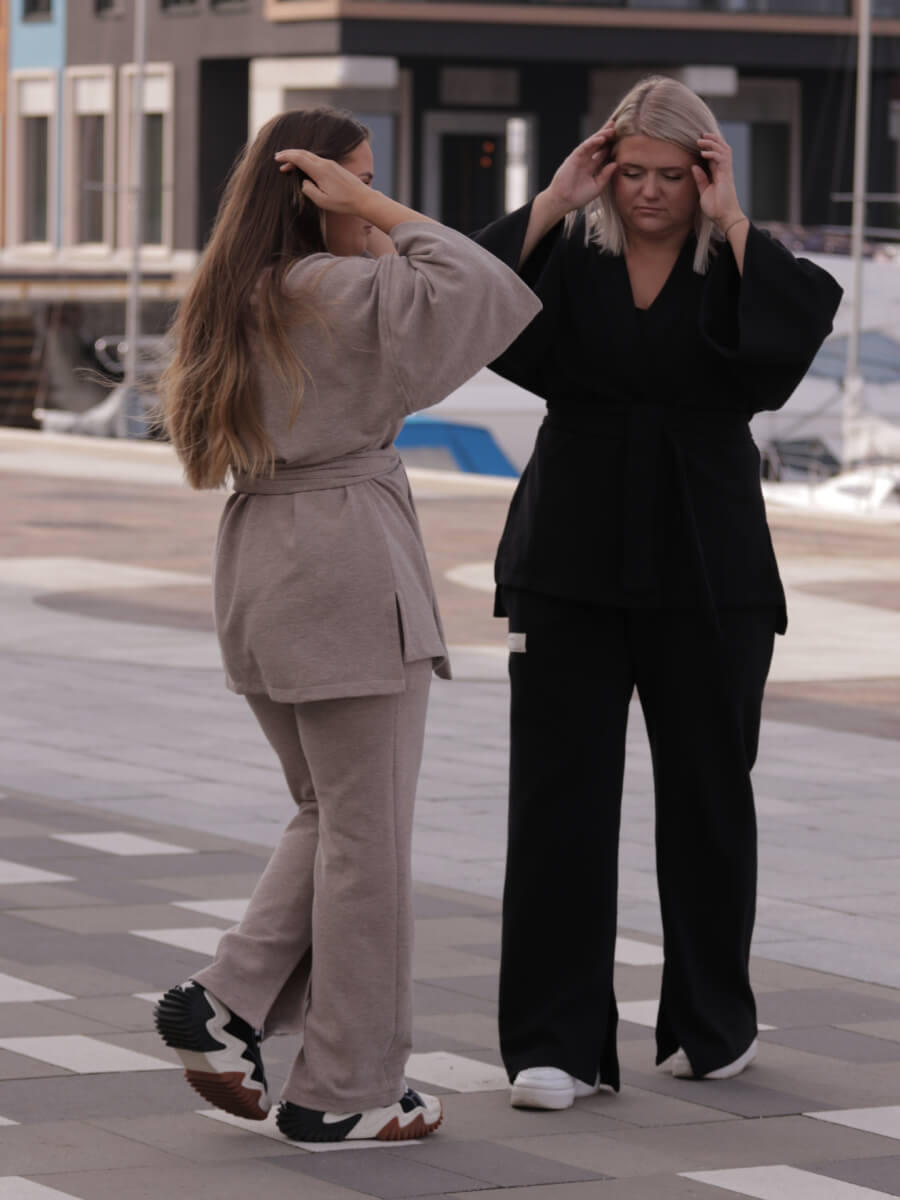 Püksid, pusa ja kimono-jakk on loodud nii, et neid saaks kombineerida omavahel ja ka erinevate teiste riietega, andes kandjale võimaluse luua mitmeid erinevaid stiile. Loomulik beež ja ajatu must värvivalik sobib suurepäraselt ülejäänud garderoobiga, andes lõputult kombineerimisvõimalusi. Nii beež, must kui khaki kangas on efektse triibu tekstuuriga.