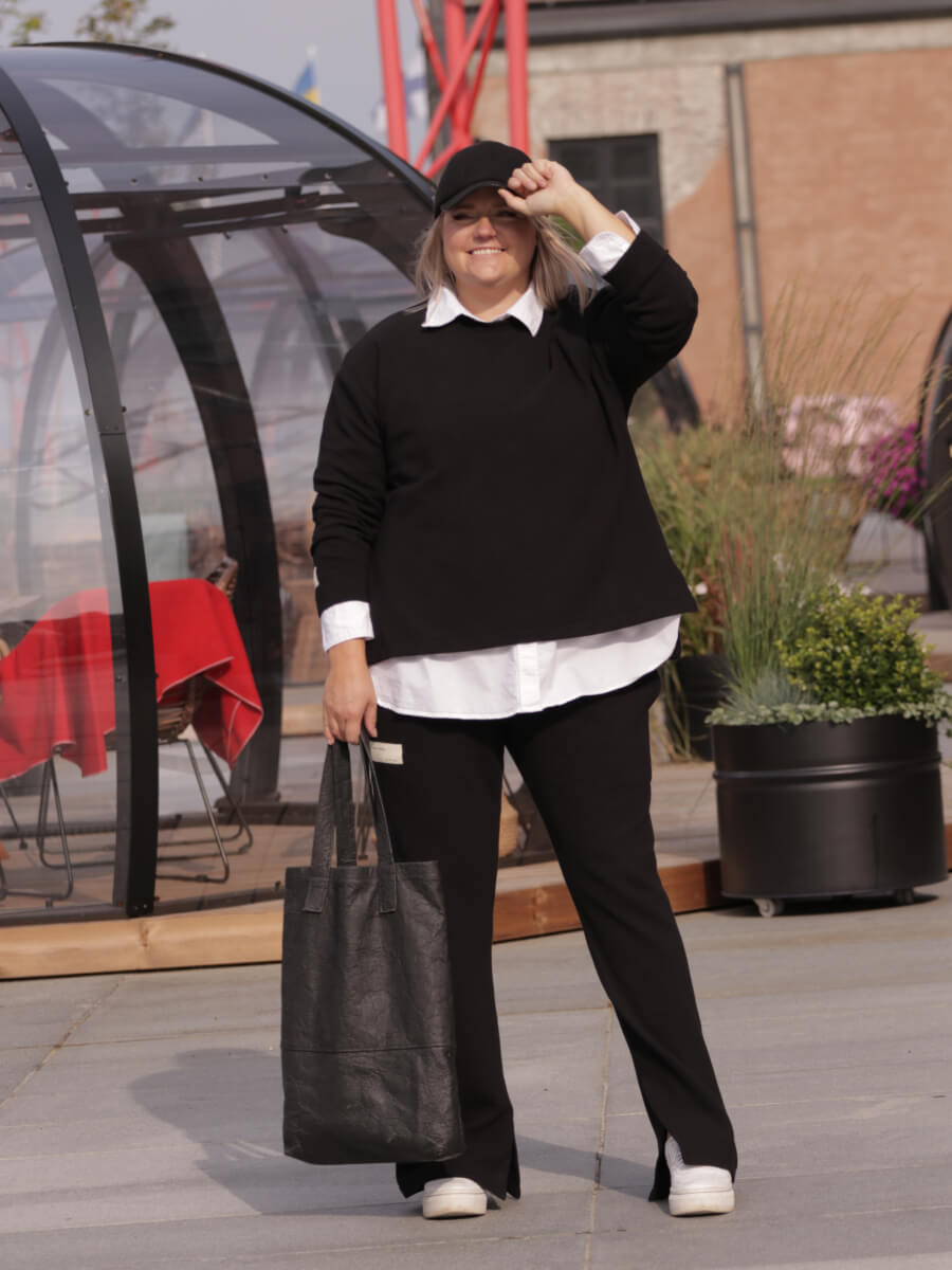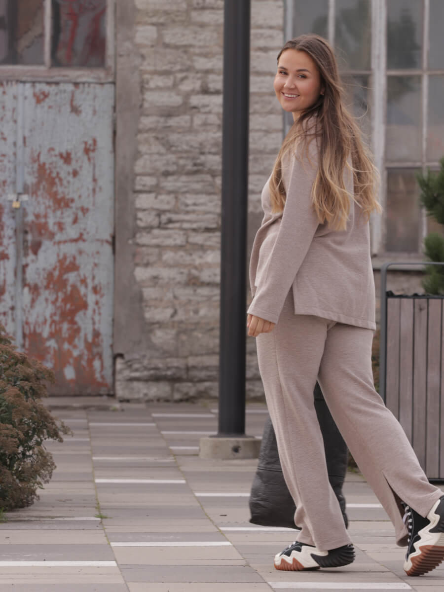 Püksid, pusa ja kimono-jakk on loodud nii, et neid saaks kombineerida omavahel ja ka erinevate teiste riietega, andes kandjale võimaluse luua mitmeid erinevaid stiile. Valikus olevad ajatud beež ja must värv on kergesti kokku sobituvad ka teiste riideesemetega ning ideaalsed nii argipäevaseks kandmiseks ja mõneks erilisemaks hetkeks. Nii beež, kui ka must kangas on efektse triibu tekstuuriga.