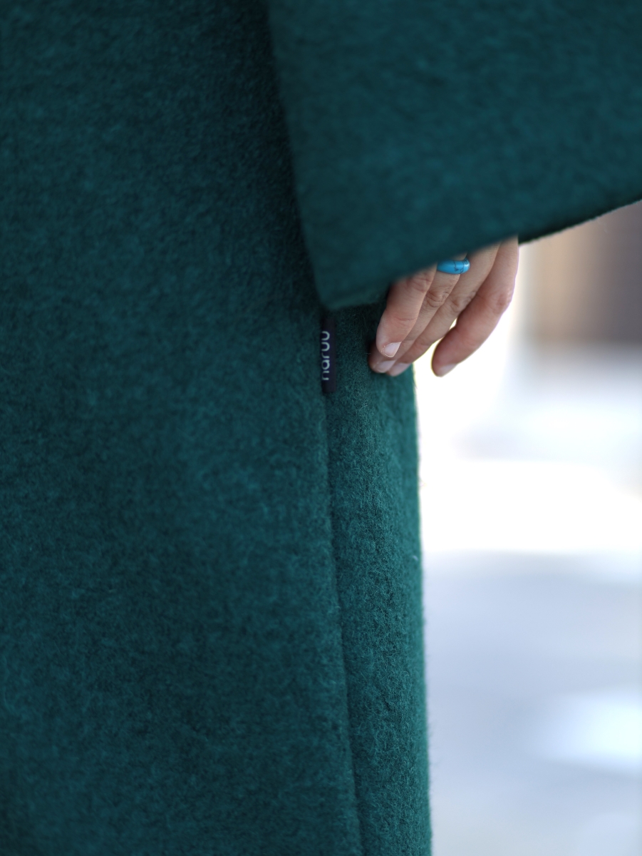 Haruu 100% lambavillast valmistatud kimono-stiilis mantel ühendab endas elegantsi, mugavuse ja praktilisuse. Mantli disain on loodud Haruu loojate Kristiine ja Virko koostöös, pidades silmas nii igapäevast kandmist kui ka pidulikke sündmusi. Kristiine eesmärgiks oli luua mantel, mis on minimalistlik ja ajatu, kuid samal ajal šikk. Virko pööras tähelepanu detailidele, lisades disainile praktilised elemendid nagu mahukad taskud, isikupärase laia vöö ja kõrge kaeluse, mis on nii stiilne kui ka funktsionaalne.