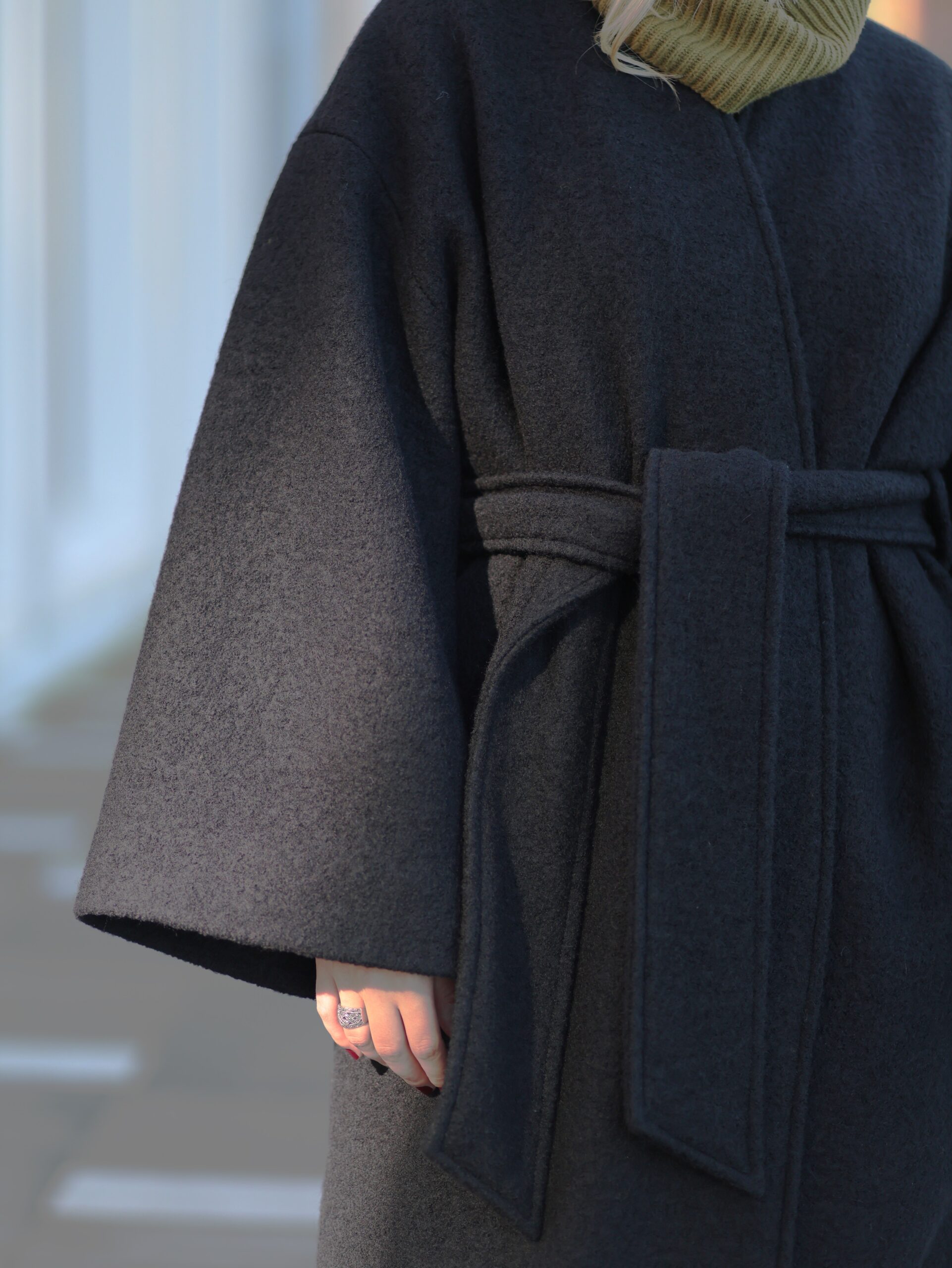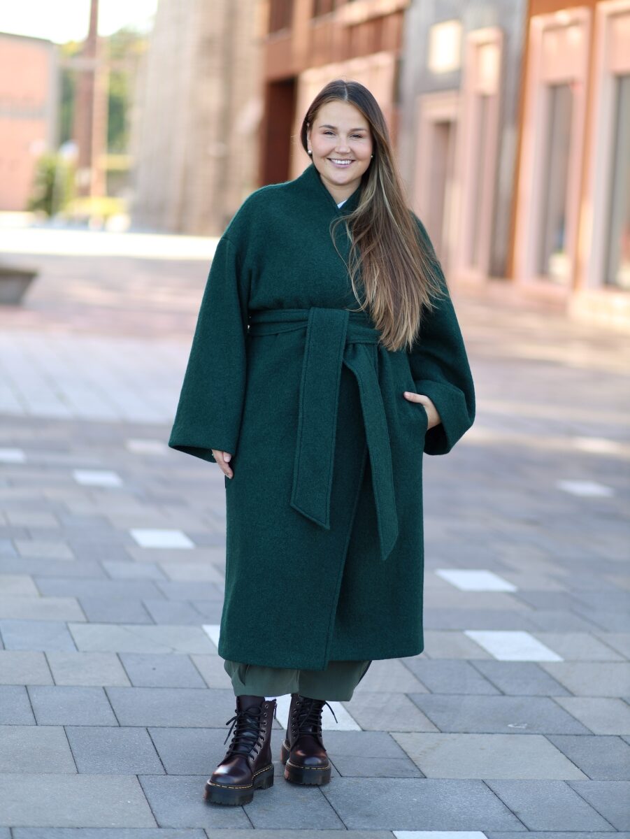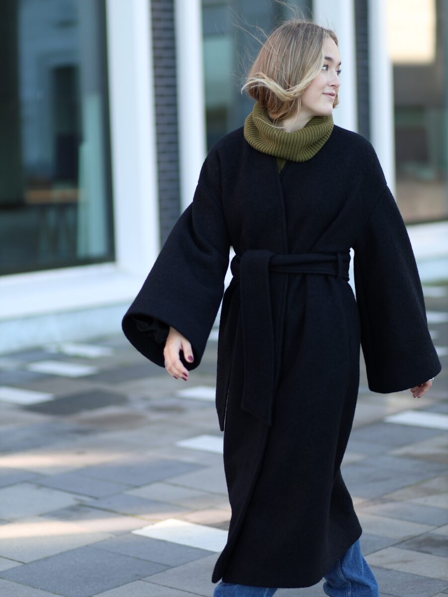 Mantlit on kolmes värvitoonis, must, mürkroheline ja beež. Kimono lõige tagab kandjale liikumisvabaduse ja soojuse – 100% lambavill reguleerib soojust imeliselt. Laieneva lõikega varrukad pakuvad mugavust, samal ajal soojust kaotamata ning vööga saab rõhutada figuuri. Kõrge kaelus näeb hea välja, hoides kandjat samal ajal soojas.
