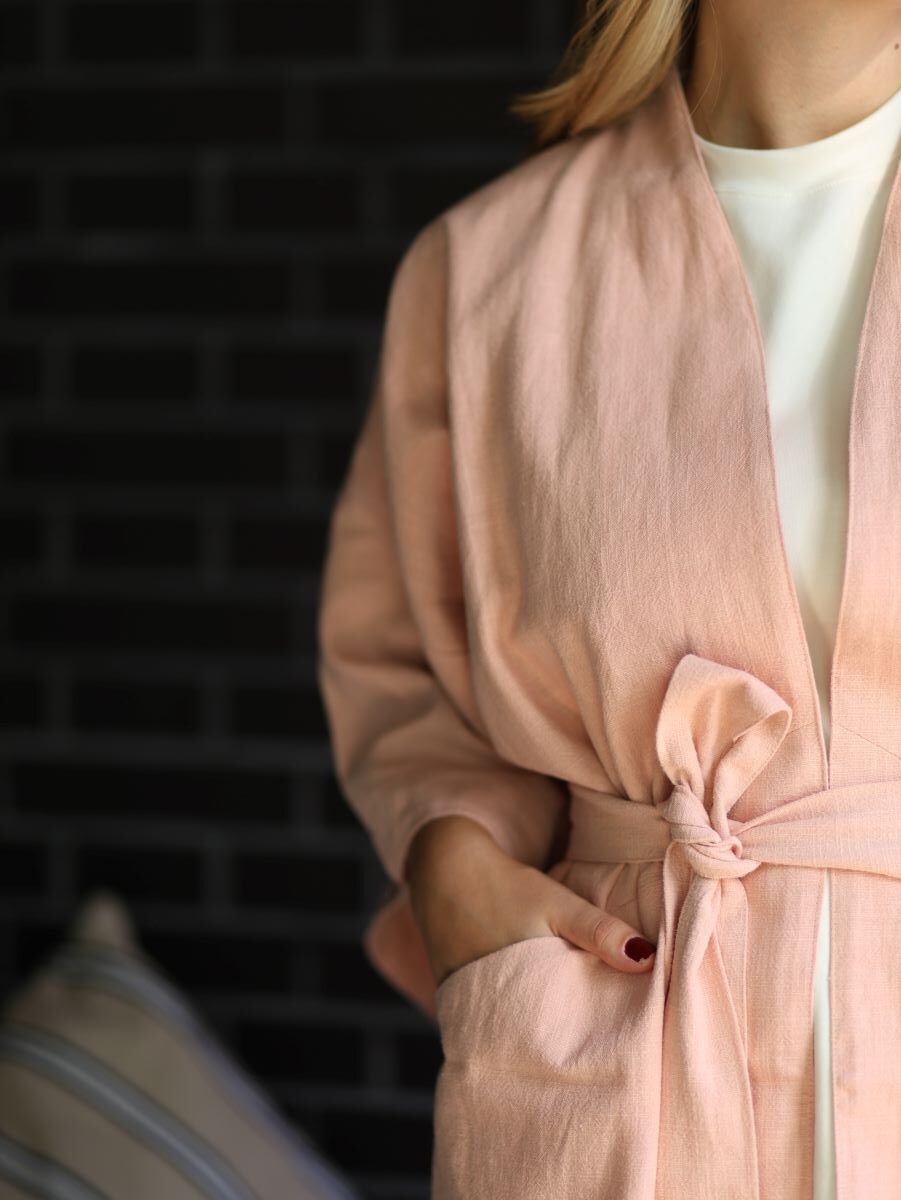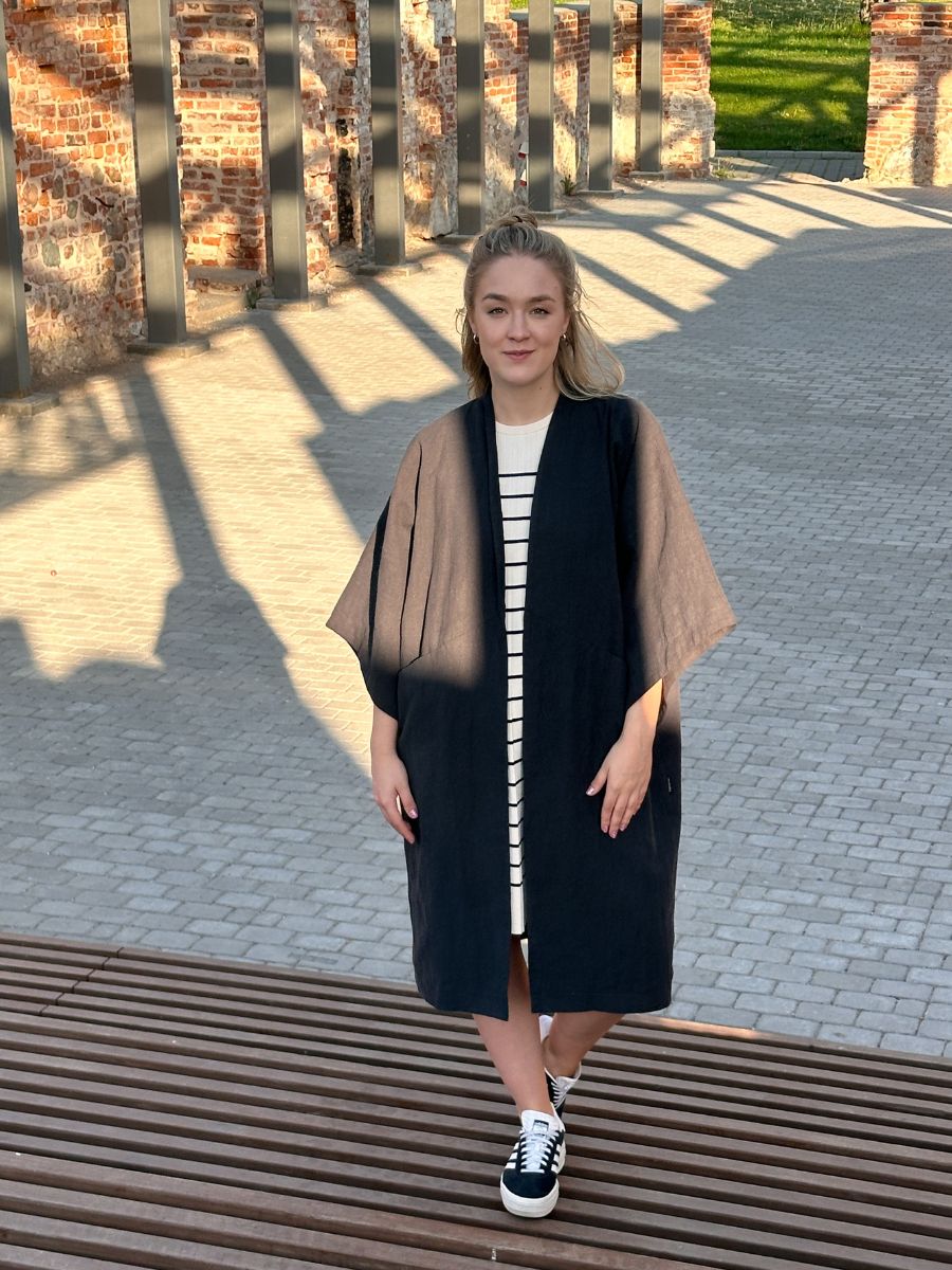 Kimono sobib kandmiseks sisejakina, soojemal ajal ka välisjakina. Kivipestud linane on nahale pehme, keskkonnasõbralik ning ei kortsu. Kimono on suurus one size ja XXL. Selja tagant mõõdetuna on kimono 109cm pikk. Sisevooder on 100% ÖKO-TEX puuvill.