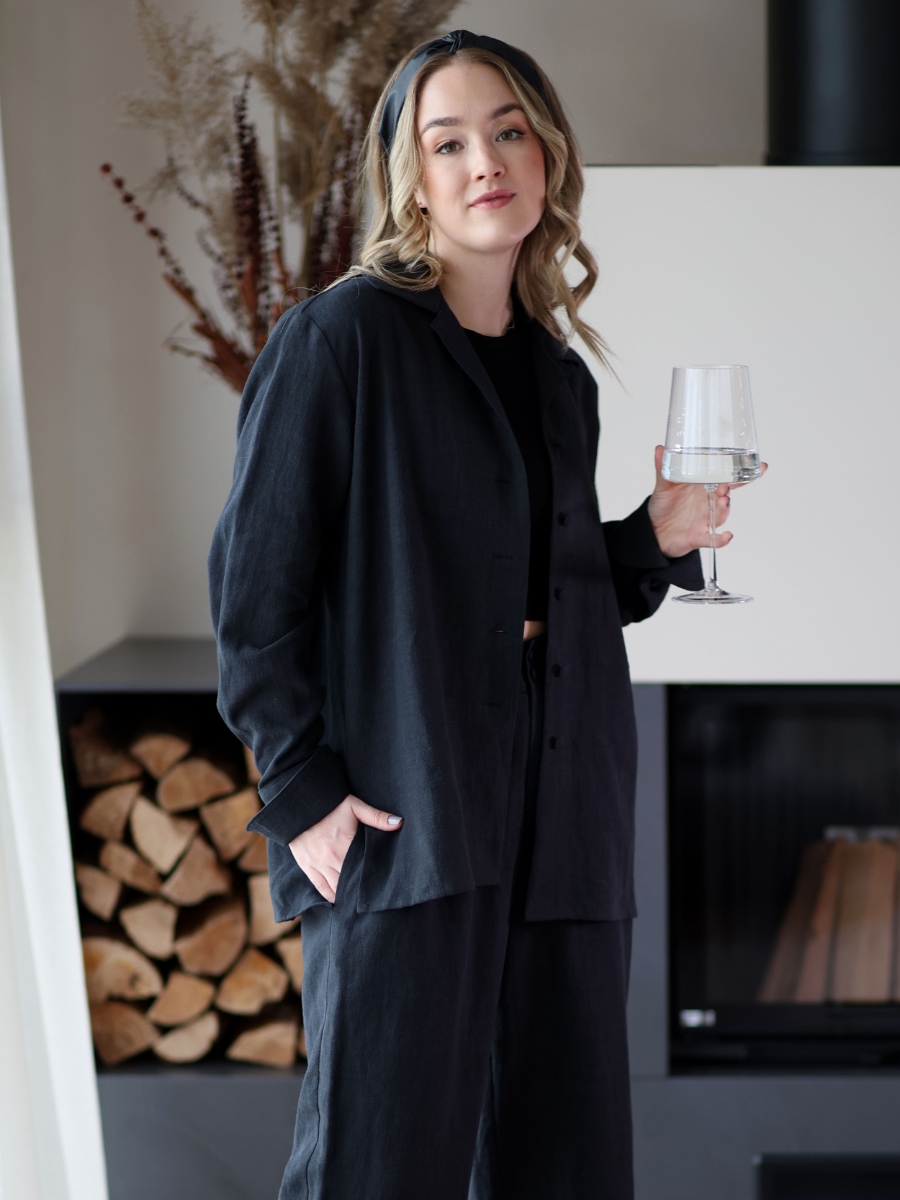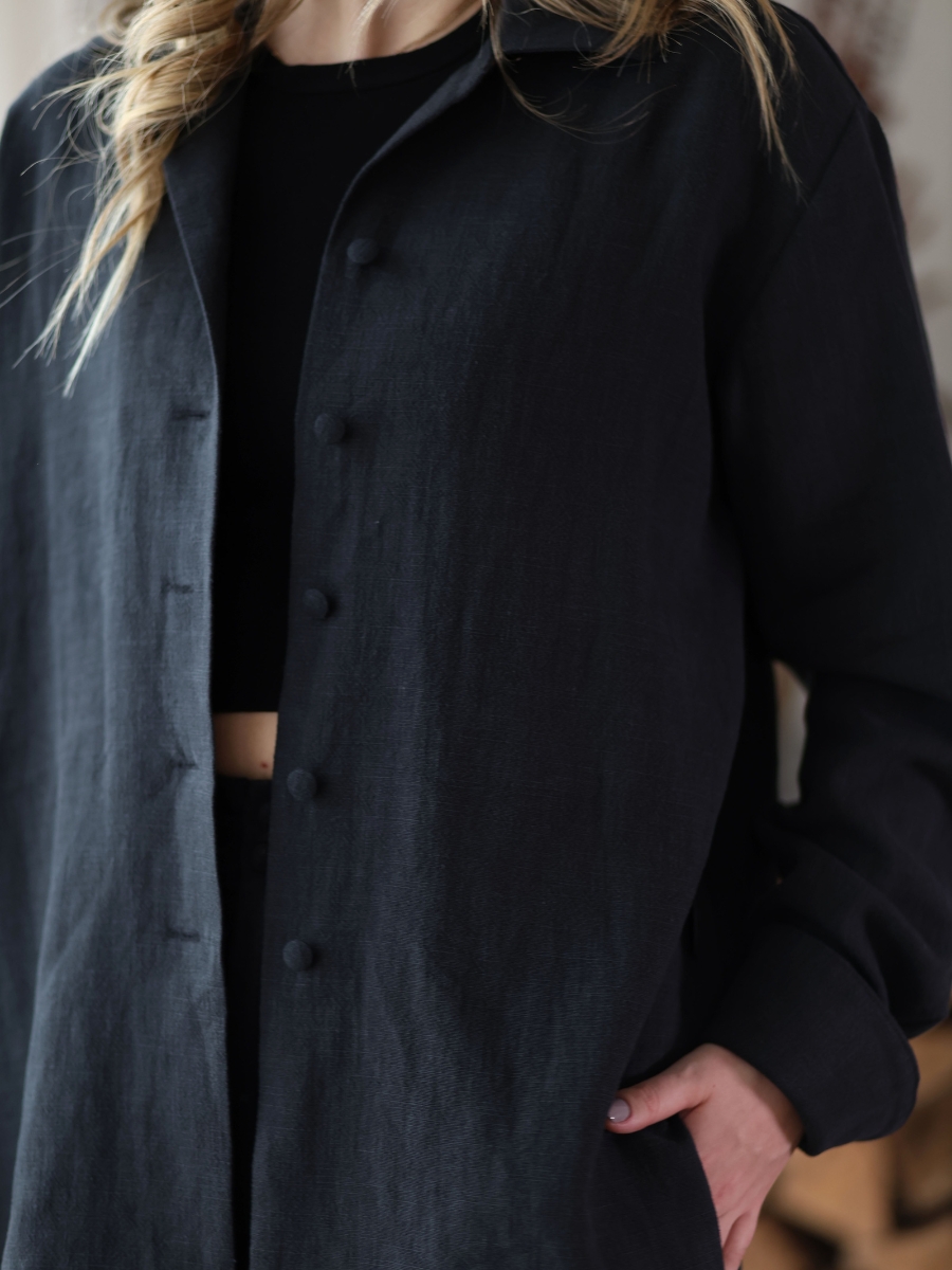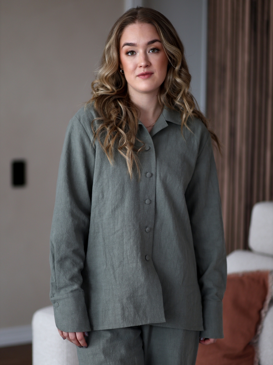 Avasta meie kollektsiooni linane triiksärk, mis ühendab endas looduse tarkuse ja ajatu disaini. Haruu linasest pluusil on kergelt over-sized lõige ja varrukad, mida saab nii üles keerata, kui ka kanda pikemalt, vastavalt eelistusele. Erilist tähelepanu köidavad hoolikalt läbimõeldud varrukadetailid, mis annavad klassikalisele lõikele kaasaegse puudutuse.Linasest pluusi on lihtne kanda peaaegu nagu jakina, sest kangaga kaetud nööbid võimaldavad seda. Sobib kanda igapäevaselt kui ka pidulikematel üritustel. Pluusiga samasse komplekti kuuluvad ka linased püksid.