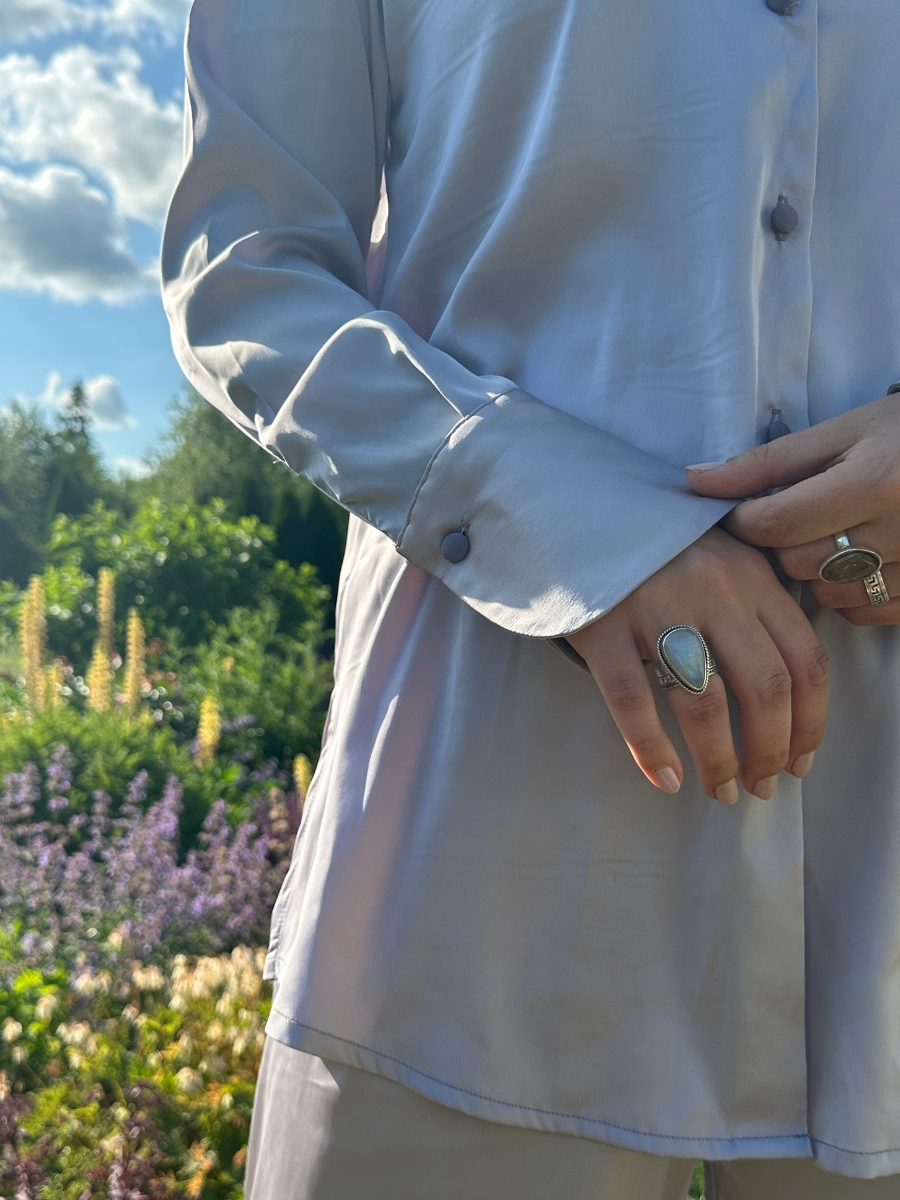 See eest nööpidega ja veidi oversized lõikega siidist pluus on loodud ülimat mugavust silmas pidades, pakkudes samal ajal võimalust luua mitmekesiseid kombinatsioone. Seda pluusi saab kanda meie siidist pükstega, andes tulemuseks elegantse komplekti. Samas saad seda pluusi stiilselt ühendada juba oma garderoobis olemasolevate esemetega.